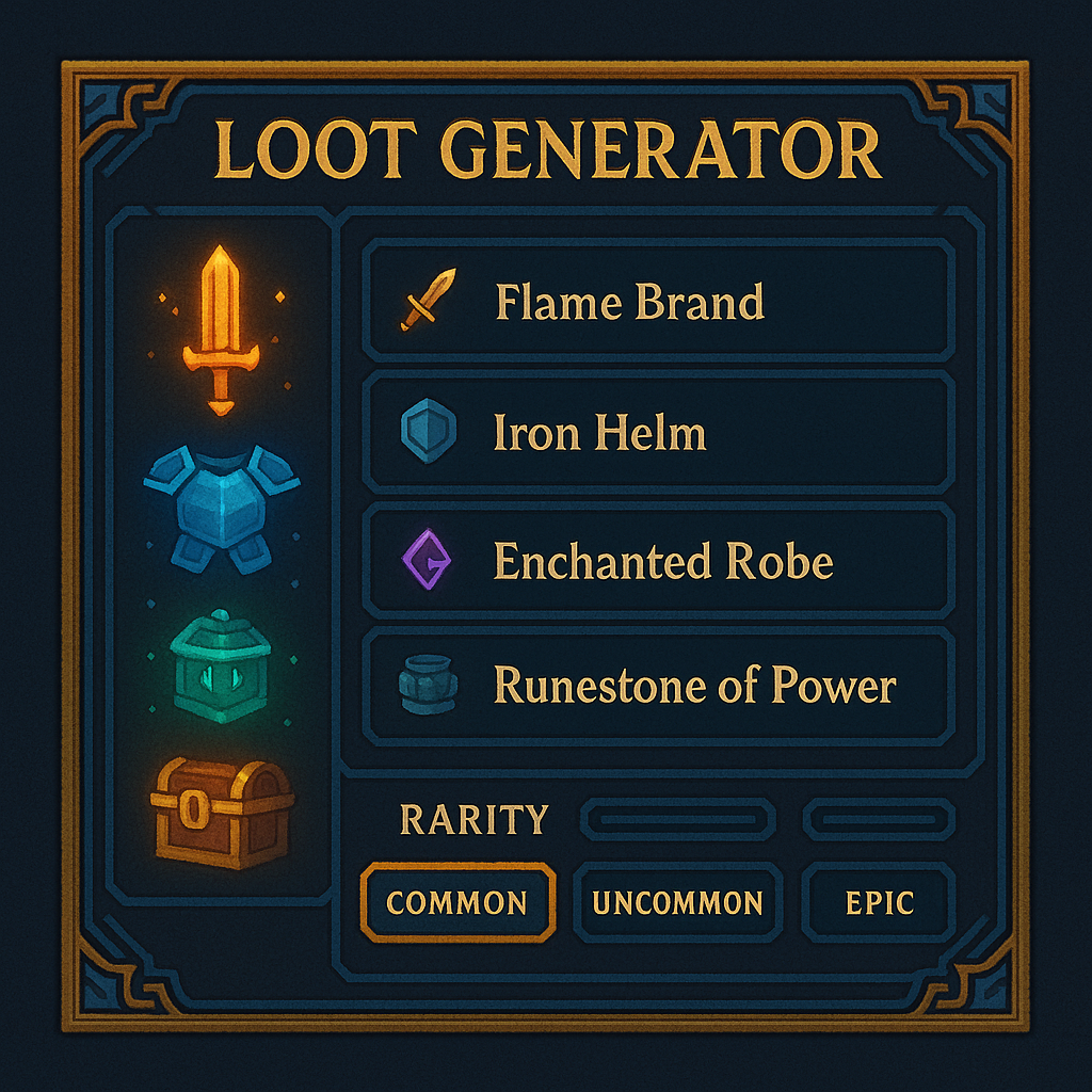 Say goodbye to bland loot! This digital generator combines procedural logic with a curated fantasy item database to produce unique weapons, armor, potions, and magical artifacts — complete with rarity, modifiers, and flavor descriptions.
